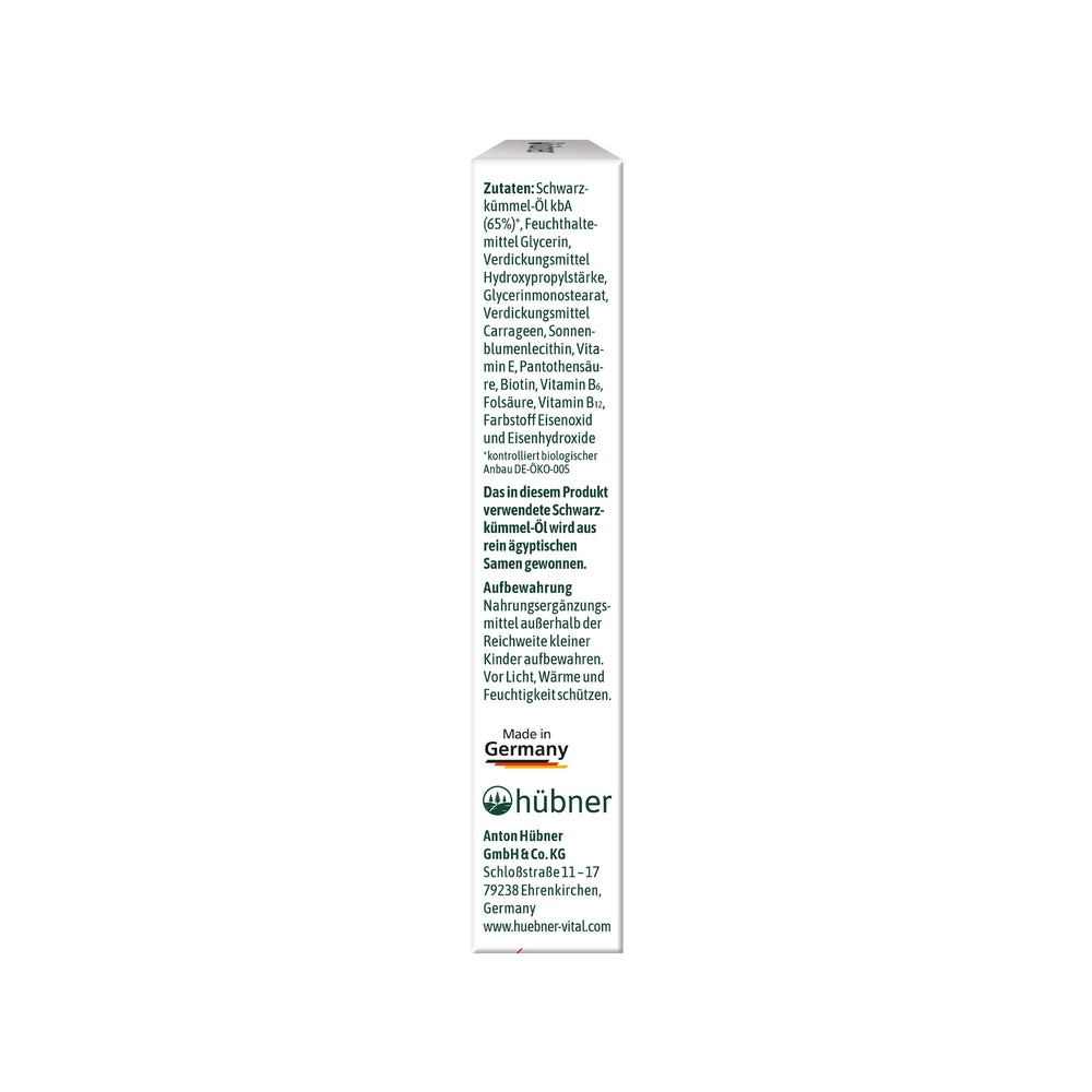 Schwarzkümmelöl (67,9 %), Trennmittel Mono- und Diglyceride von Speisefettsäuren, Vitamin E, CalciumPantothenat, Vitamin B6, Antioxidationsmittel Tocopherol, Folsäure, Biotin, Vitamin B12, Kapselhülle: Gelatine, Feuchthaltemittel Glycerin, Wasser, Feuchthaltemittel Sorbit, Farbstoff: Eisenoxid.