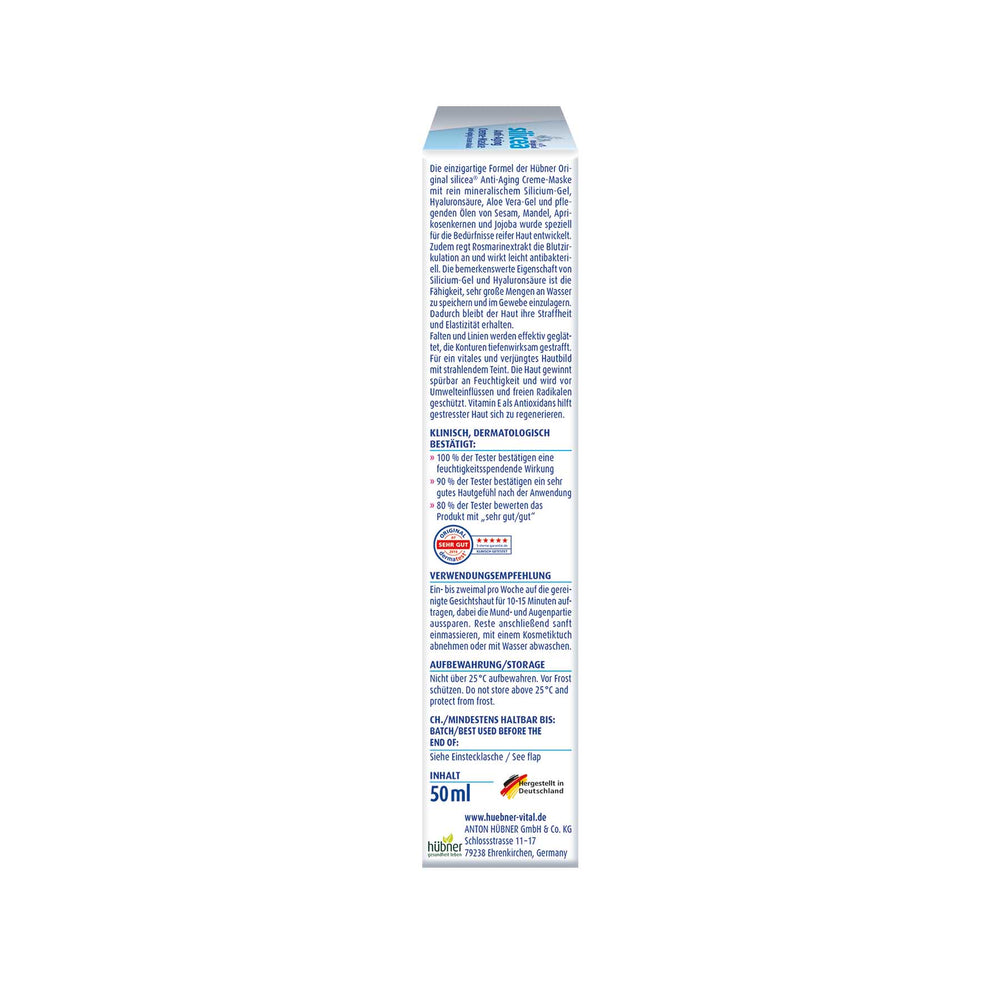 Die einzigartige Formel der Hübner Original silicea® Anti-Aging Creme-Maske mit rein mineralischem Silicium-Gel, Hyaluronsäure, Aloe Vera-Gel und pflegenden Ölen von Sesam, Mandel, Aprikosenkernen und Jojoba wurde speziell für die Bedürfnisse reifer Haut entwickelt. Zudem regt Rosmarinextrakt die Blutzirkulation an und wirkt leicht antibakteriell.