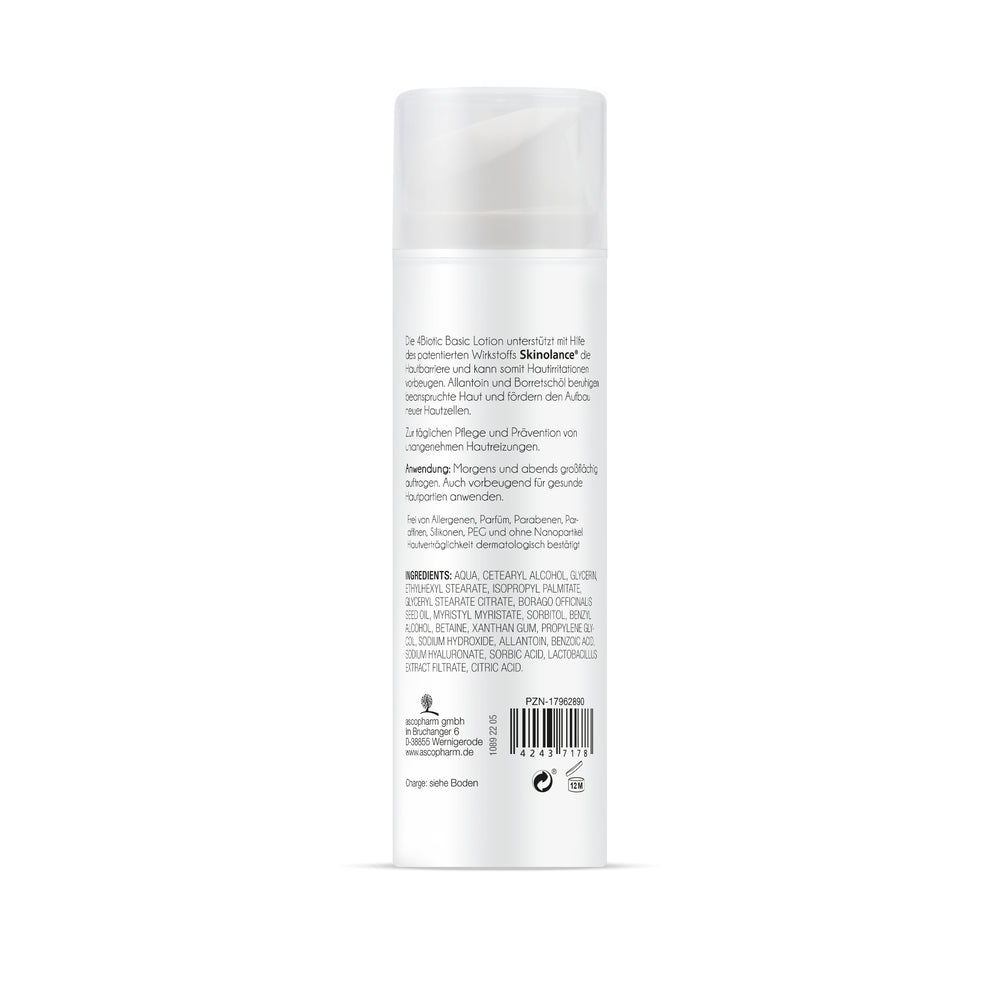 Die 4Biotic Basic Lotion unterstützt mit Hilfe des patentierten Wirkstoffs Skinolance® die Hautbarriere und kann somit Hautirritationen vorbeugen. Allantoin und Borretschöl beruhigen beanspruchte Haut und fördern den Aufbau neuer Hautzellen. Zur täglichen Pflege und Prävention von unangenehmen Hautreizungen.