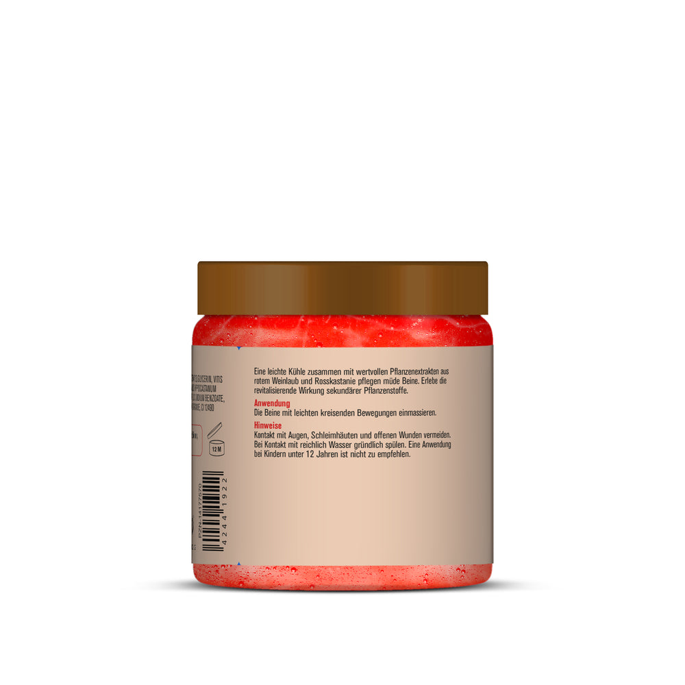 Mit Rosskastanie & Rotem WeinlaubEine leichte Kühle zusammen mit wertvollen Pflanzenextrakten aus rotem Weinlaub und Rosskastanie pflegen müde Beine. Erlebe die revitalisierende Wirkung sekundärer Pflanzenstoffe.
