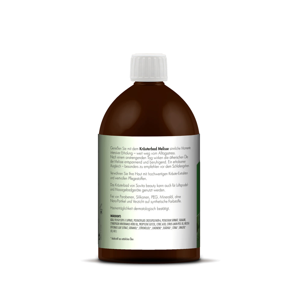 Genießen Sie mit dem Kräuterbad Melisse sinnliche Momente intensiver Erholung – weit weg vom Alltagsstress. Nach einem anstrengenden Tag wirken die ätherischen Öle der Melisse entspannend und beruhigend. Ein erholsamer Ausgleich – besonders zu empfehlen vor dem Schlafengehen. Verwöhnen Sie Ihre Haut mit hochwertigen Kräuter-Extrakten und wertvollen Pflegestoffen. Das Kräuterbad von Sovita beauty kann auch für Luftsprudel- und Massagebadgeräte genutzt werden.