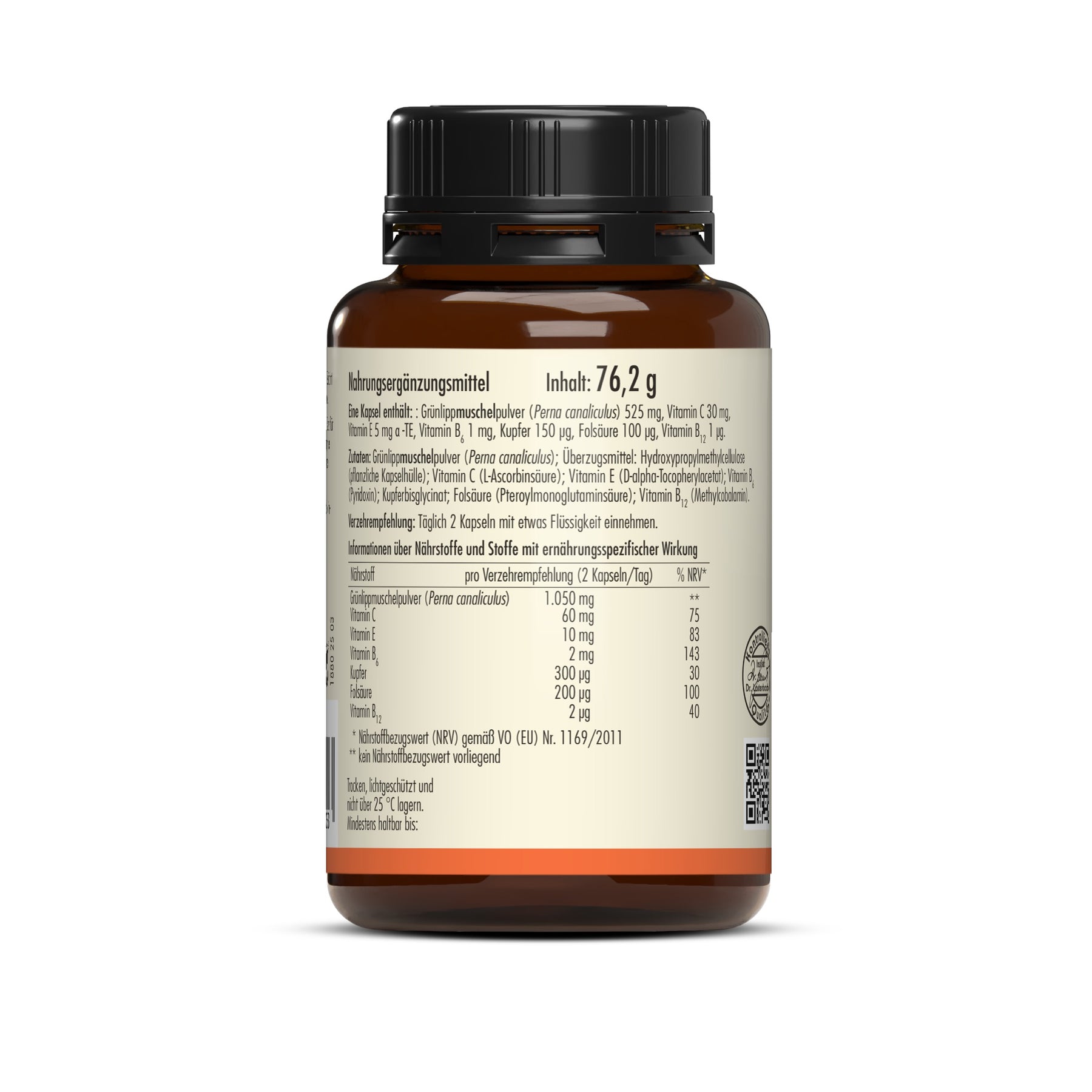 Das verwendete Vollfettpulver aus der Grünlippmuschel stammt aus nachhaltiger Zucht in Neuseeland. Es bewahrt den natürlichen Fettanteil der Muschel. Dadurch bleiben auch die enthaltenen Omega-3-Fettsäuren erhalten – darunter ETA (Eicosatetraensäure), eine seltene Form, die ausschließlich in der Grünlippmuschel vorkommt. ETA wird im Zusammenhang mit der Ernährung geschätzt, da sie ähnliche Eigenschaften wie EPA aufweist, aber seltener vorkommt. In der Grünlippmuschel liegt ETA in natürlicher Form vor und ist daher ein interessanter Bestandteil von Produkten mit Vollfettpulver aus dieser Muschelart. Die Kombination mit Vitamin C, E sowie den B-Vitaminen ergänzt die Rezeptur sinnvoll – insbesondere bei einem erhöhten Nährstoffbedarf oder im Rahmen einer bewussten Lebensweise.