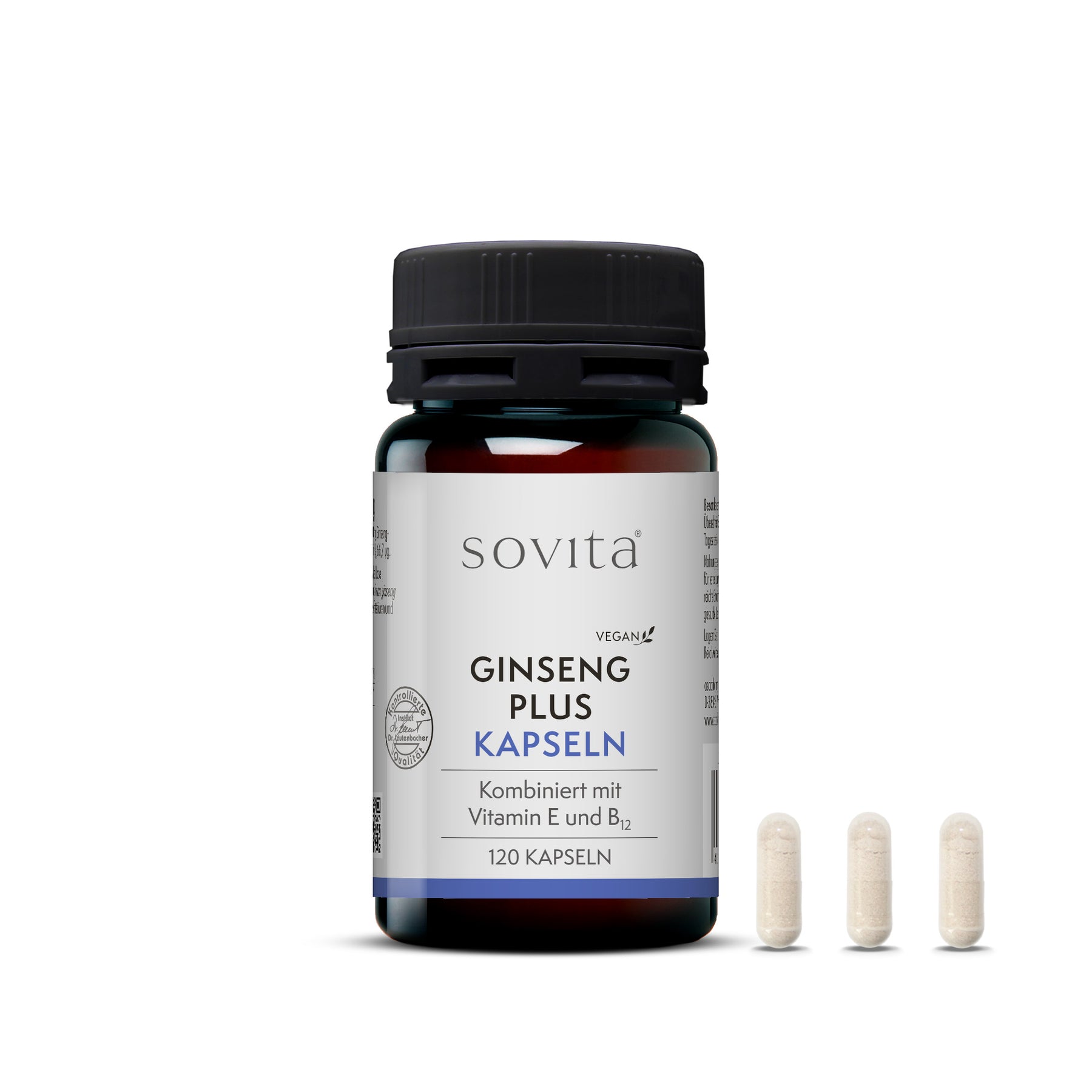 Die sovita Ginseng Plus Kapseln enthalten einen wertvollen Ginsengextrakt kombiniert mit natürlichem Vitamin E und Vitamin B12. Vitamin E schützt die Zellen vor oxidativem Stress, während Vitamin B12  zur Verringerung von Müdigkeit und Ermüdung beiträgt und die normale Funktion des Nervensystems unterstützt.