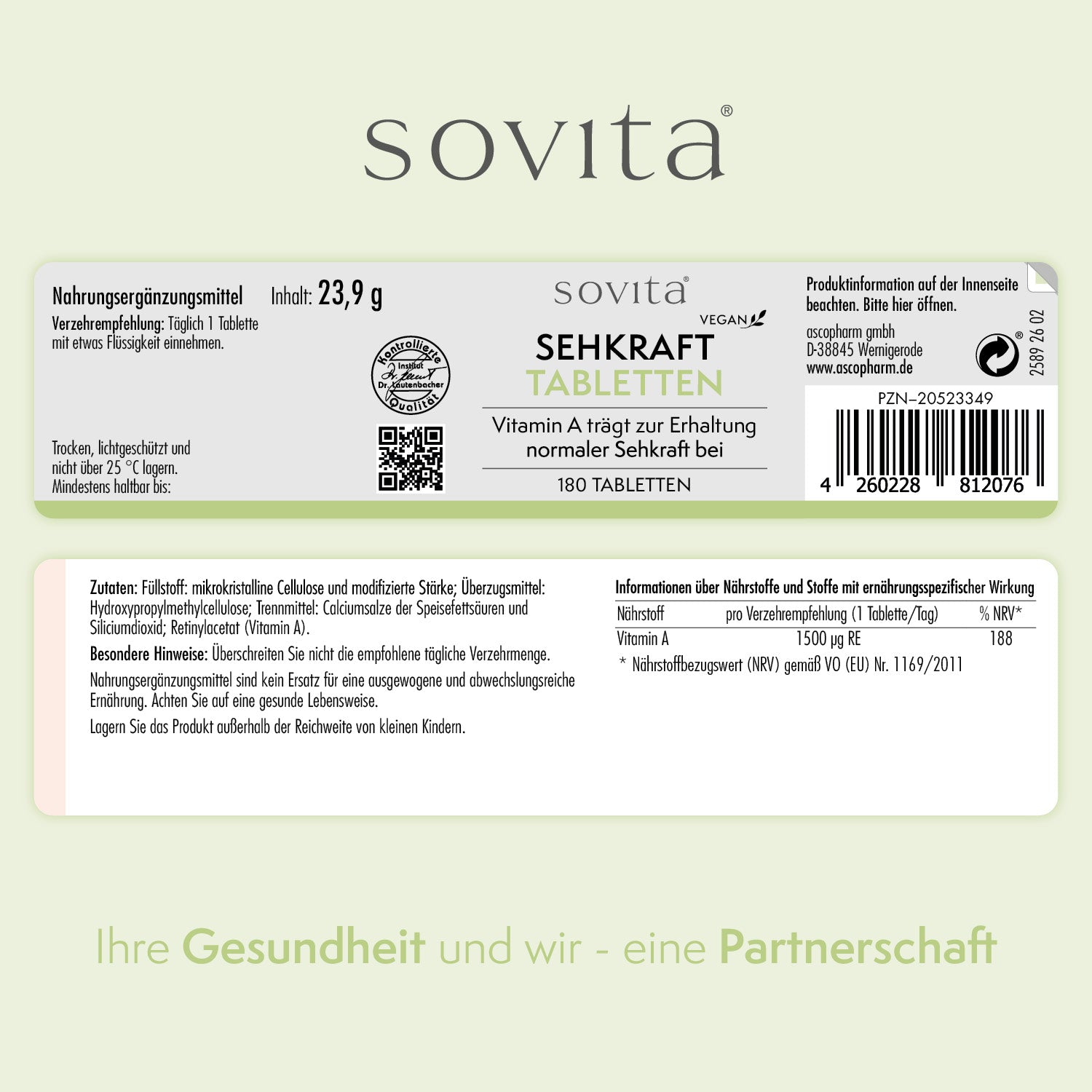 Die sovita Sehkraft Tabletten wurden speziell für Menschen entwickelt, die ihre Augen bewusst in den Mittelpunkt ihrer Nährstoffversorgung stellen möchten. Die Rezeptur enthält 1500 µg RE Vitamin A (5000 I.E.) pro Tablette und deckt damit 188 % des täglichen Referenzwertes ab.