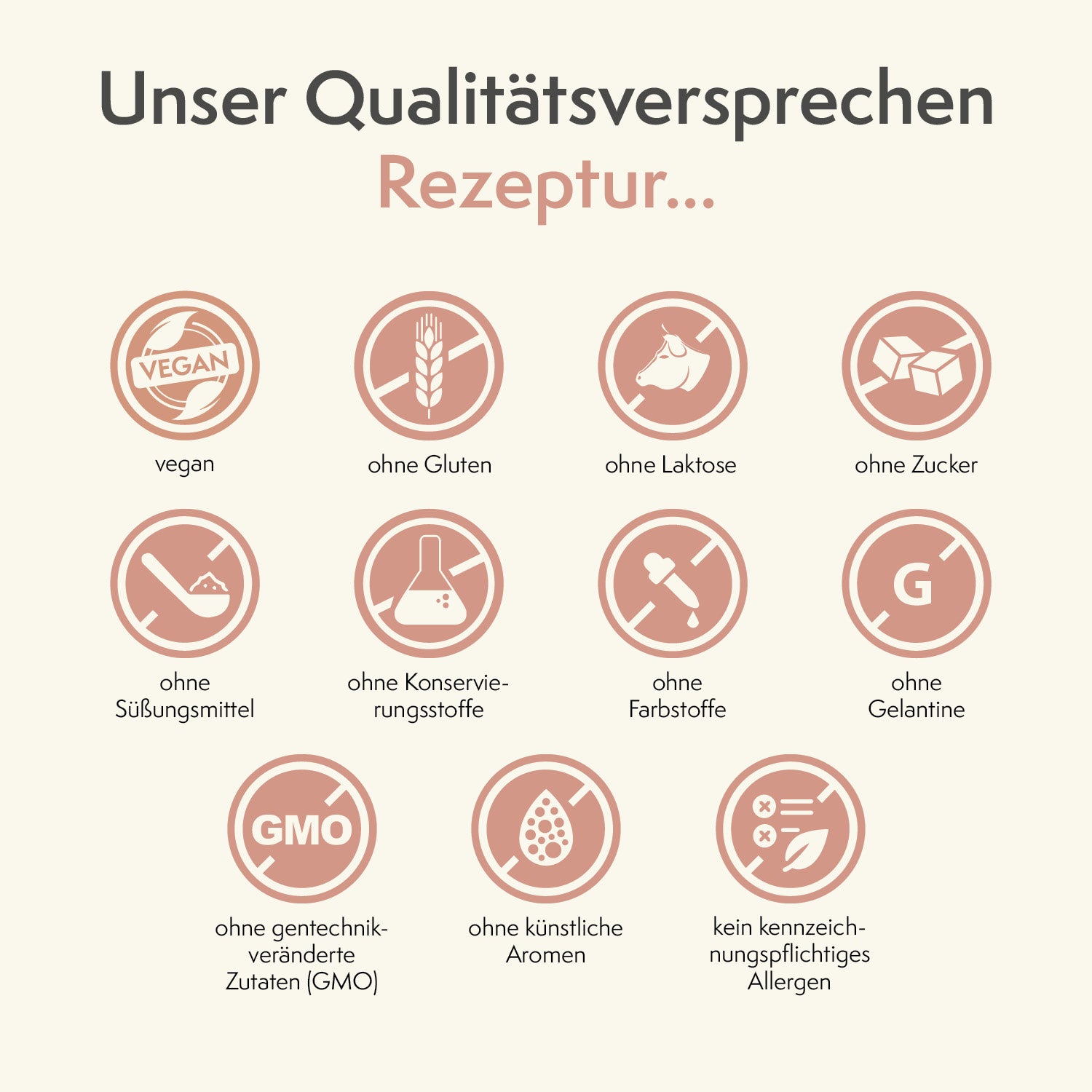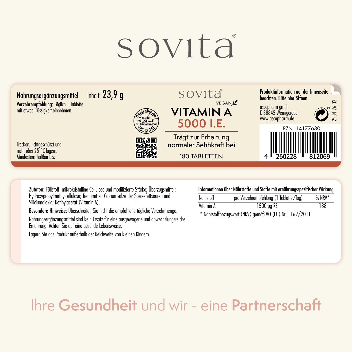 Füllstoff: mikrokristalline Cellulose und modifizierte Stärke; Überzugsmittel: Hydroxypropylmethylcellulose; Trennmittel: Calciumsalze der Speisefettsäuren und Siliciumdioxid; Retinylacetat (Vitamin A).