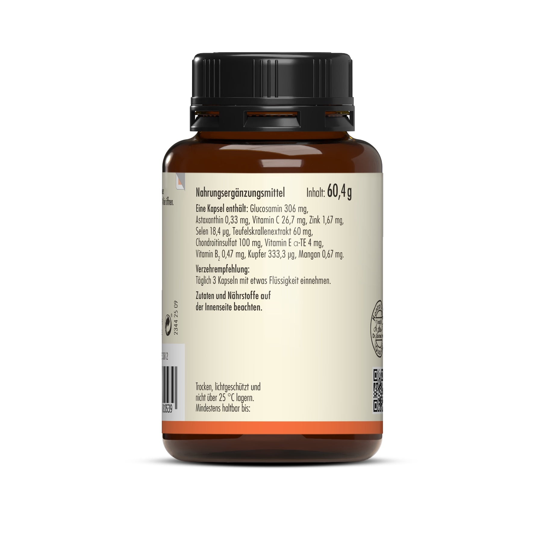 Glucosaminhydrochlorid aus Krebstieren; Überzugsmittel: Hydroxypropylmethylcellulose (pflanzliche Kapselhülle); Chondroitinsulfat; Teufelskrallenextrakt; Vitamin C (L-Ascorbinsäure); Vitamin E (D-alpha-Tocopherylacetat); astaxanthinhaltiger Algenextrakt aus Haematococcus pluvialis; Mangangluconat; Zinkbisglycinat; Kupferbisglycinat; Vitamin B2 (Riboflavin); Natriumselenit.