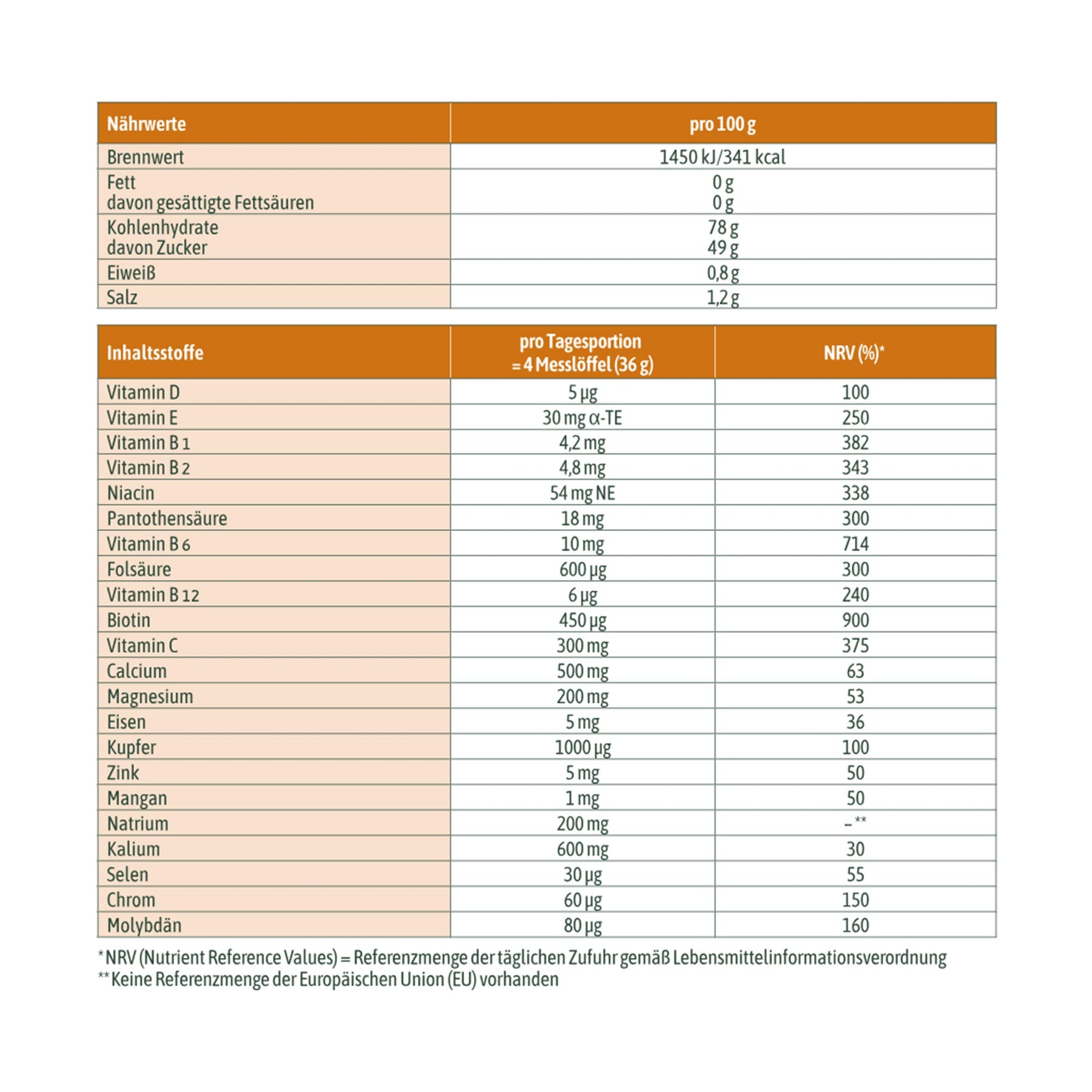 Nahrungsergänzungsmittel mit Mineralstoffen und Vitaminen. Mit Zuckern und Süßungsmittel. In Pulverform mit basischen Mineralstoffen und Spurenelementen als idealer Zusatz – insbesondere bei einem aktiven, vitalen Lebensstil.