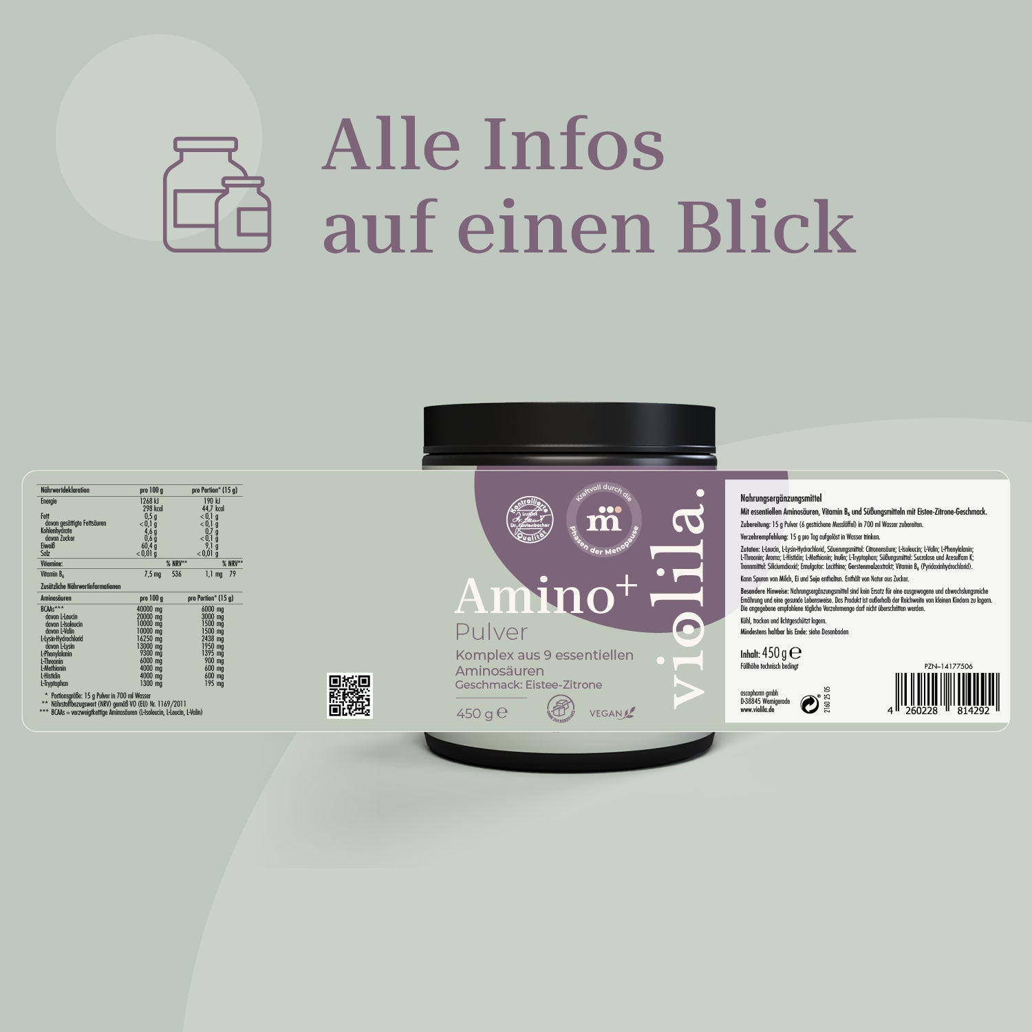 violila Amino⁺ Pulver liefert alle neun essenziellen Aminosäuren in optimaler Kombination: Leucin, Isoleucin, Valin (als BCAAs), sowie Lysin, Methionin, Threonin, Phenylalanin, Histidin und Tryptophan. Diese Aminosäuren kann der Körper nicht selbst herstellen – sie müssen regelmäßig über die Ernährung aufgenommen werden.