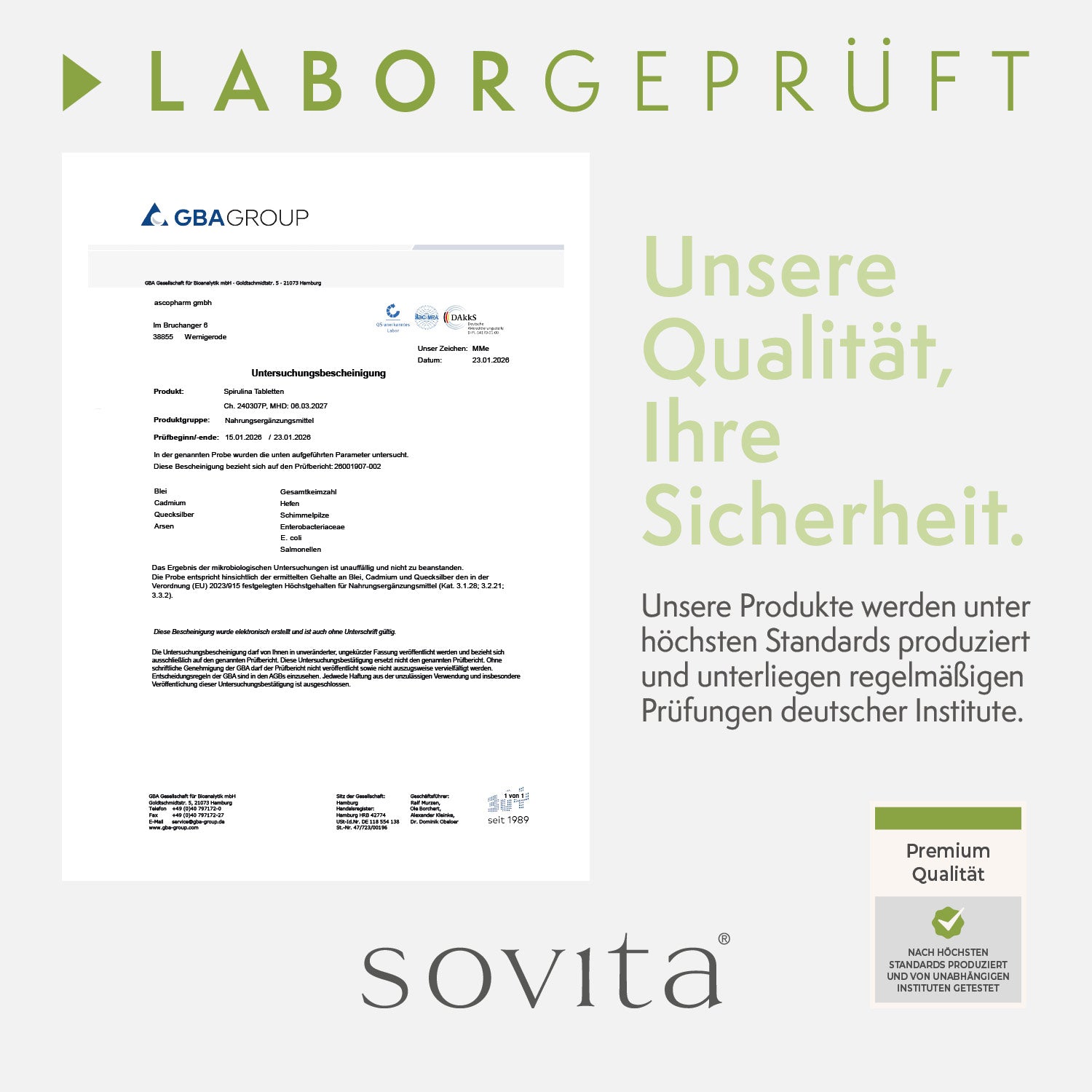 Die sovita BIO Spirulina Tabletten bestehen zu 100 % aus reinem Spirulina platensis-Pulver, das unter kontrollierten Bedingungen kultiviert, schonend getrocknet und ohne Zusatzstoffe zu Tabletten gepresst wird. Die Mikroalge Spirulina zählt zu den ältesten bekannten Organismen und wird weltweit wegen ihrer natürlichen Nährstoffdichte geschätzt. Besonders bemerkenswert ist ihr hoher Proteingehalt von 60 %, wodurch sie sich hervorragend als pflanzliche Eiweißquelle eignet.