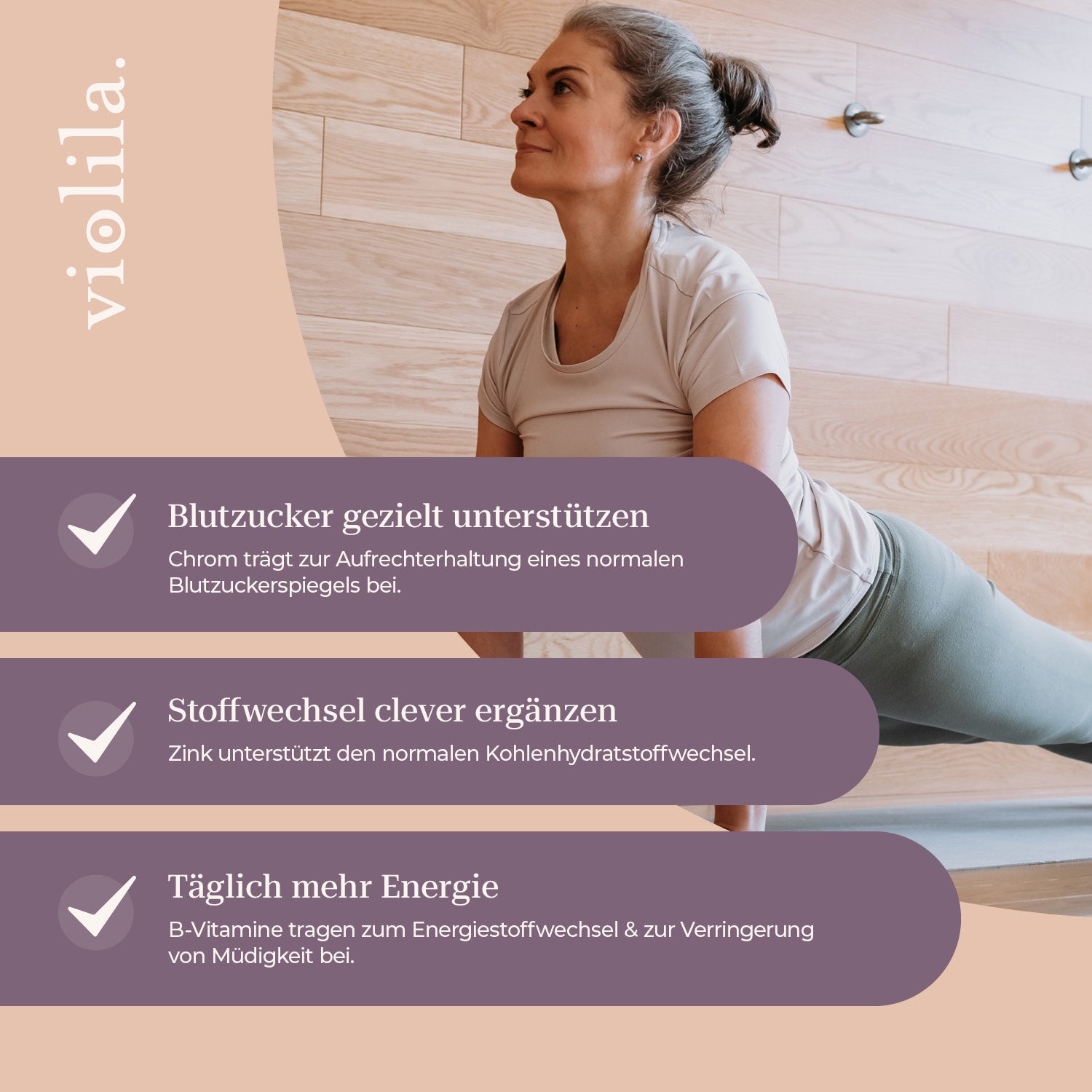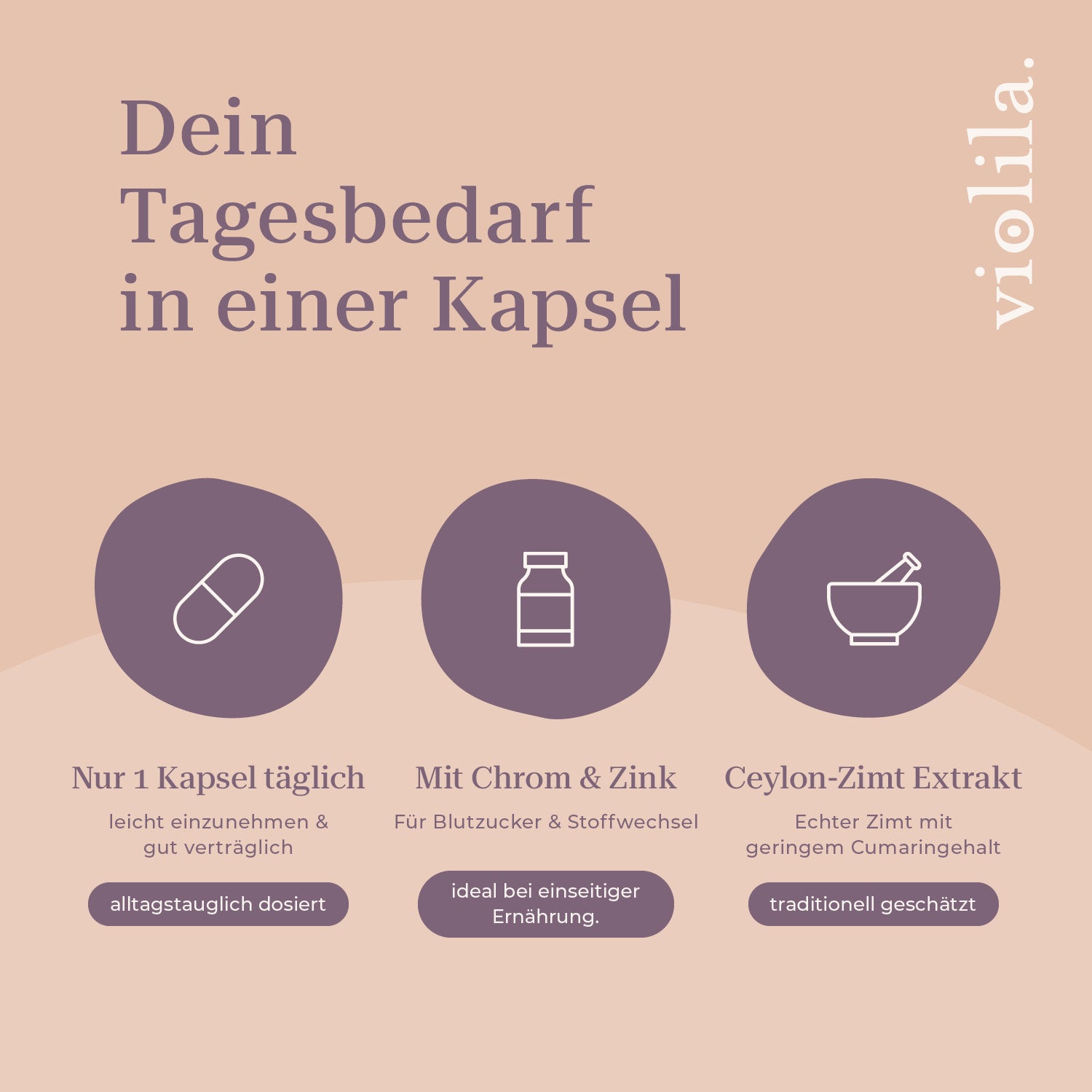 Die violila Blutzucker Kapseln enthalten sorgfältig abgestimmte Zutaten – darunter hochwertiger Ceylon-Zimtextrakt sowie Chrom, Zink und wichtige B-Vitamine.