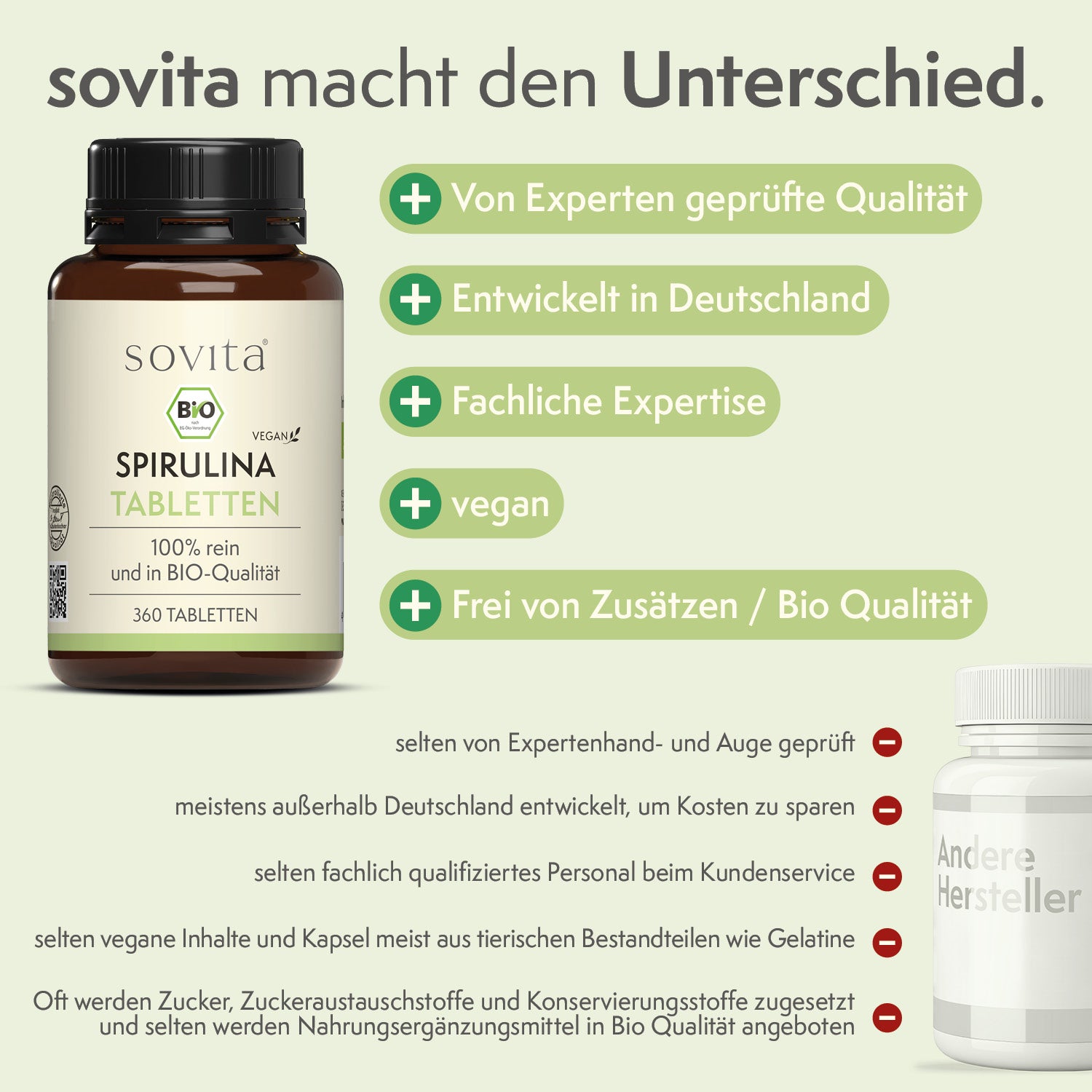 Die sovita BIO Spirulina Tabletten bestehen zu 100 % aus reinem Spirulina platensis-Pulver, das unter kontrollierten Bedingungen kultiviert, schonend getrocknet und ohne Zusatzstoffe zu Tabletten gepresst wird. Die Mikroalge Spirulina zählt zu den ältesten bekannten Organismen und wird weltweit wegen ihrer natürlichen Nährstoffdichte geschätzt. Besonders bemerkenswert ist ihr hoher Proteingehalt von 60 %, wodurch sie sich hervorragend als pflanzliche Eiweißquelle eignet.