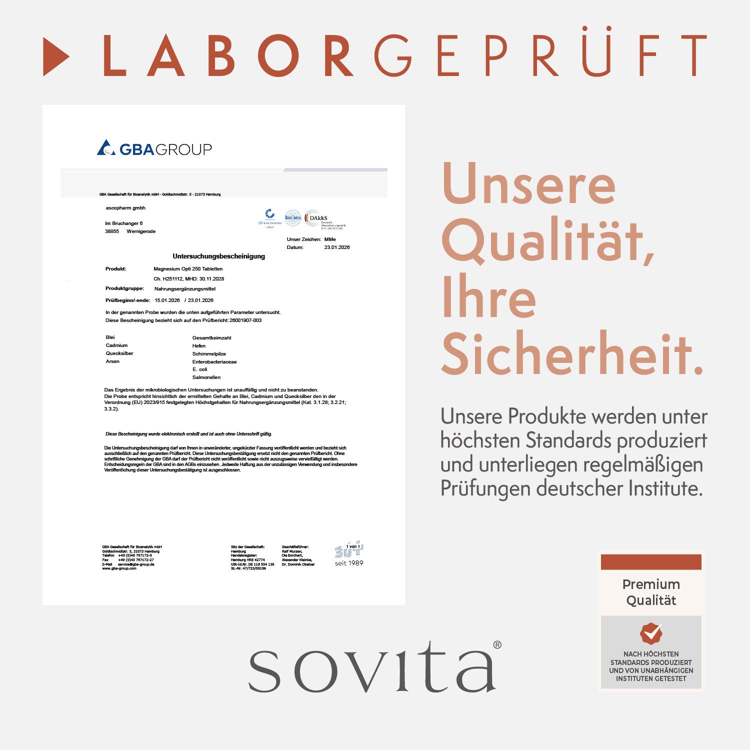 Magnesium ist ein essenzieller Mineralstoff, der an zahlreichen Stoffwechselprozessen beteiligt ist. Besonders für die normale Muskelfunktion und das Nervensystem spielt Magnesium eine wichtige Rolle. sovita Magnesium Opti 250 Tabletten liefern hochwertiges Magnesium in einer praktischen Dosierung