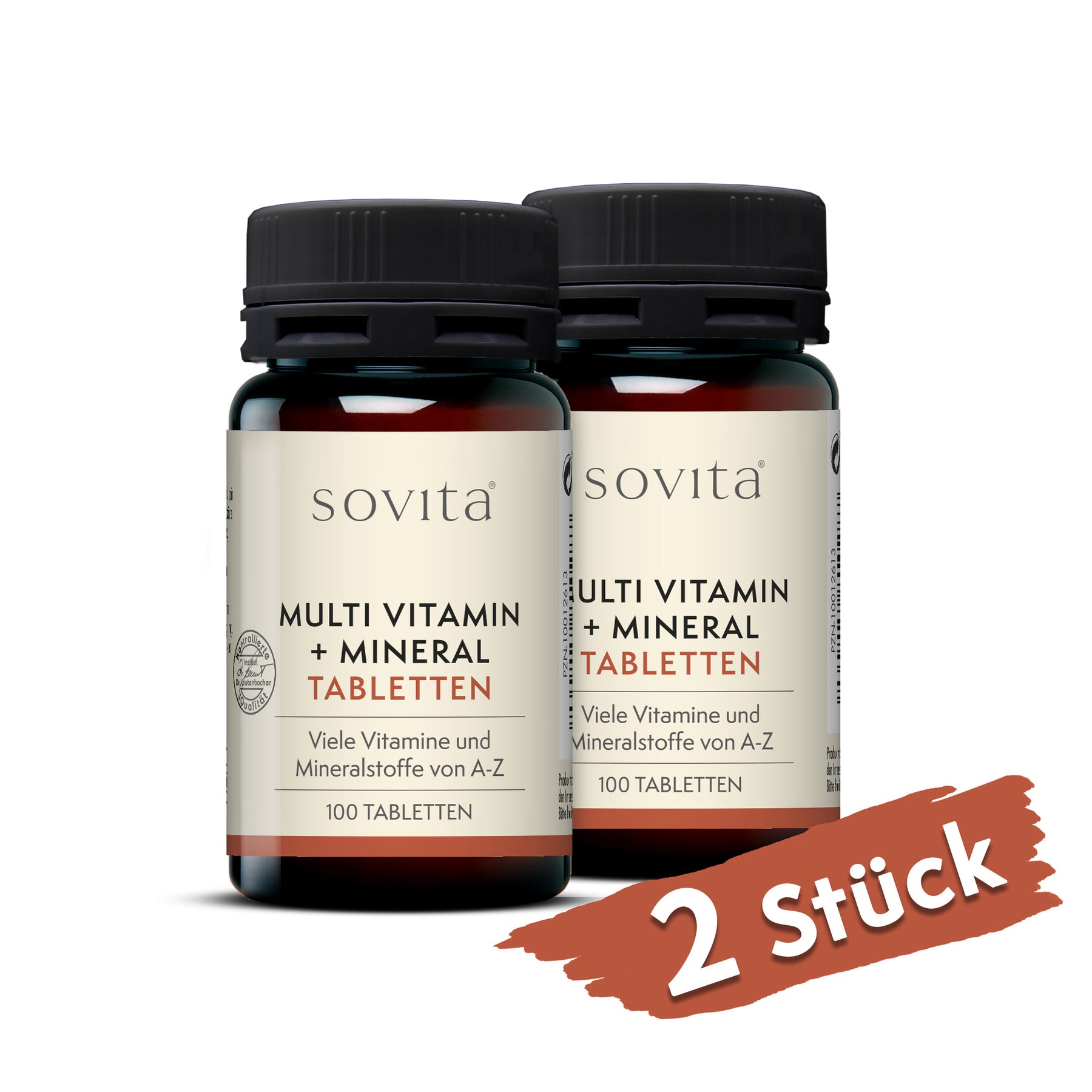 Die sovita Multi Vitamin + Mineral-Tabletten enthalten die wichtigsten Vitamine und Mineralstoffe von A bis Z. Der Mensch benötigt für die Versorgung des Körpers zahlreiche Vitamine und Mineralstoffe. Diese sind an zahlreichen Stoffwechselvorgängen beteiligt und spielen eine große Rolle im Elektrolyt- und Wasserhaushalt. Sie sind für das Immunsystem sowie für den Aufbau und Funktion von Knochen und Muskeln unverzichtbar.