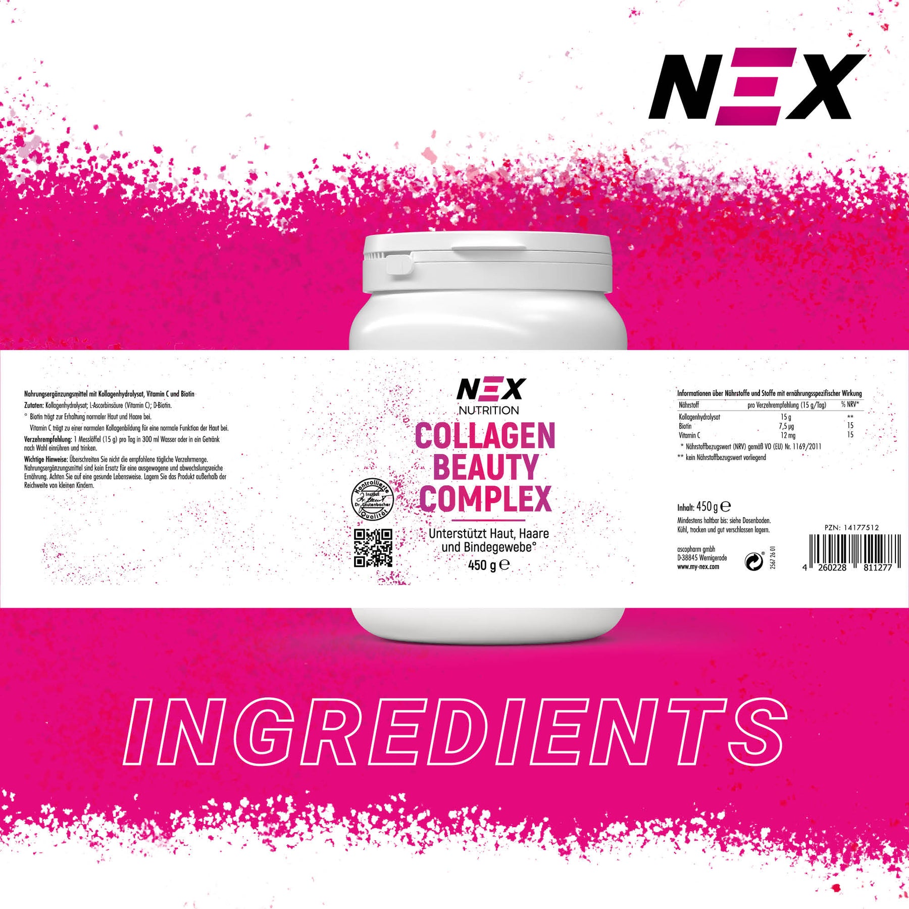 NEX Collagen Beauty Complex ist dein täglicher Routine-Step: 15 g Kollagenhydrolysat pro Portion – ergänzt mit Vitamin C und Biotin. Vitamin C unterstützt die normale Kollagenbildung für eine normale Funktion der Haut¹, Biotin trägt zum Erhalt normaler Haut²