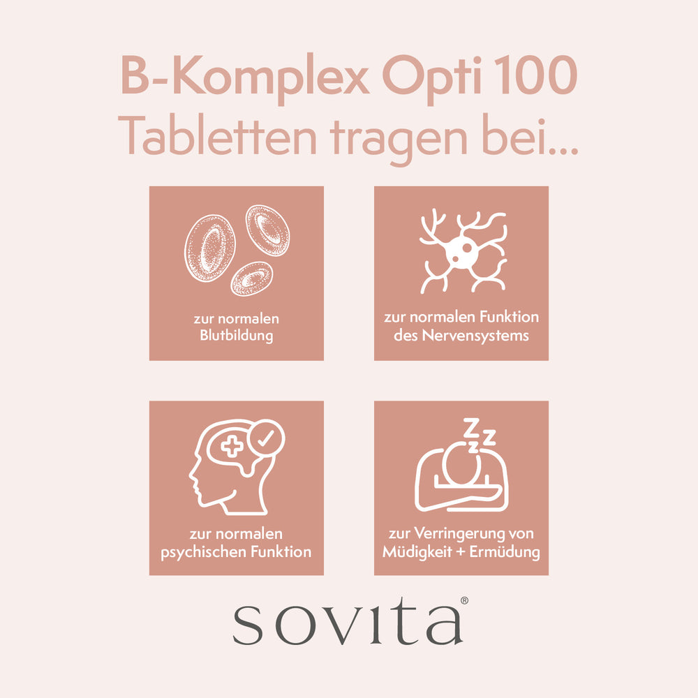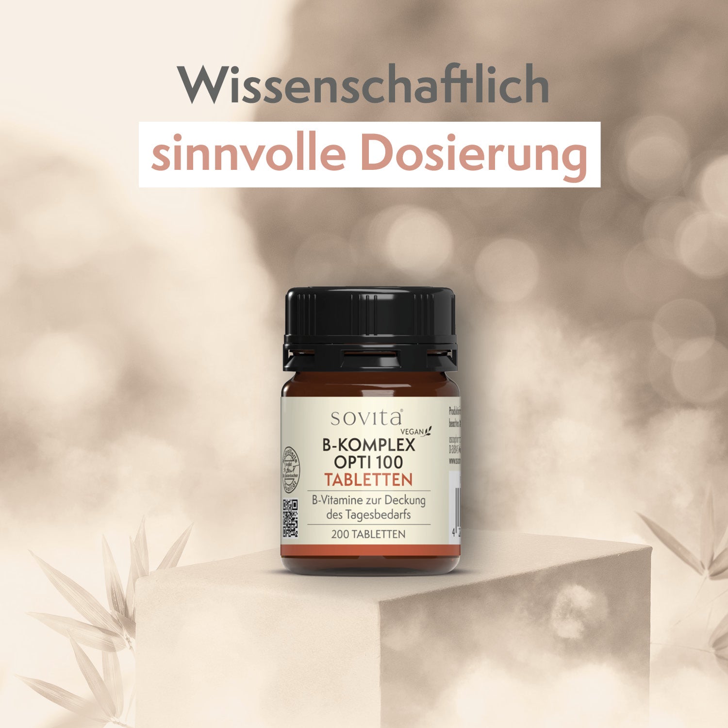 Die sovita B-Komplex Opti 100 Tabletten bieten eine durchdachte Mikronährstoffversorgung für den Alltag. Enthalten sind alle acht B-Vitamine in einer Dosierung, die exakt den empfohlenen Referenzwerten entspricht. Damit ist das Produkt eine solide Unterstützung für alle, die ihre Ernährung sinnvoll ergänzen möchten – besonders bei einseitiger Kost.