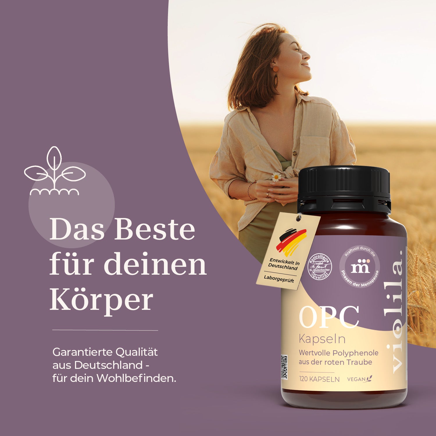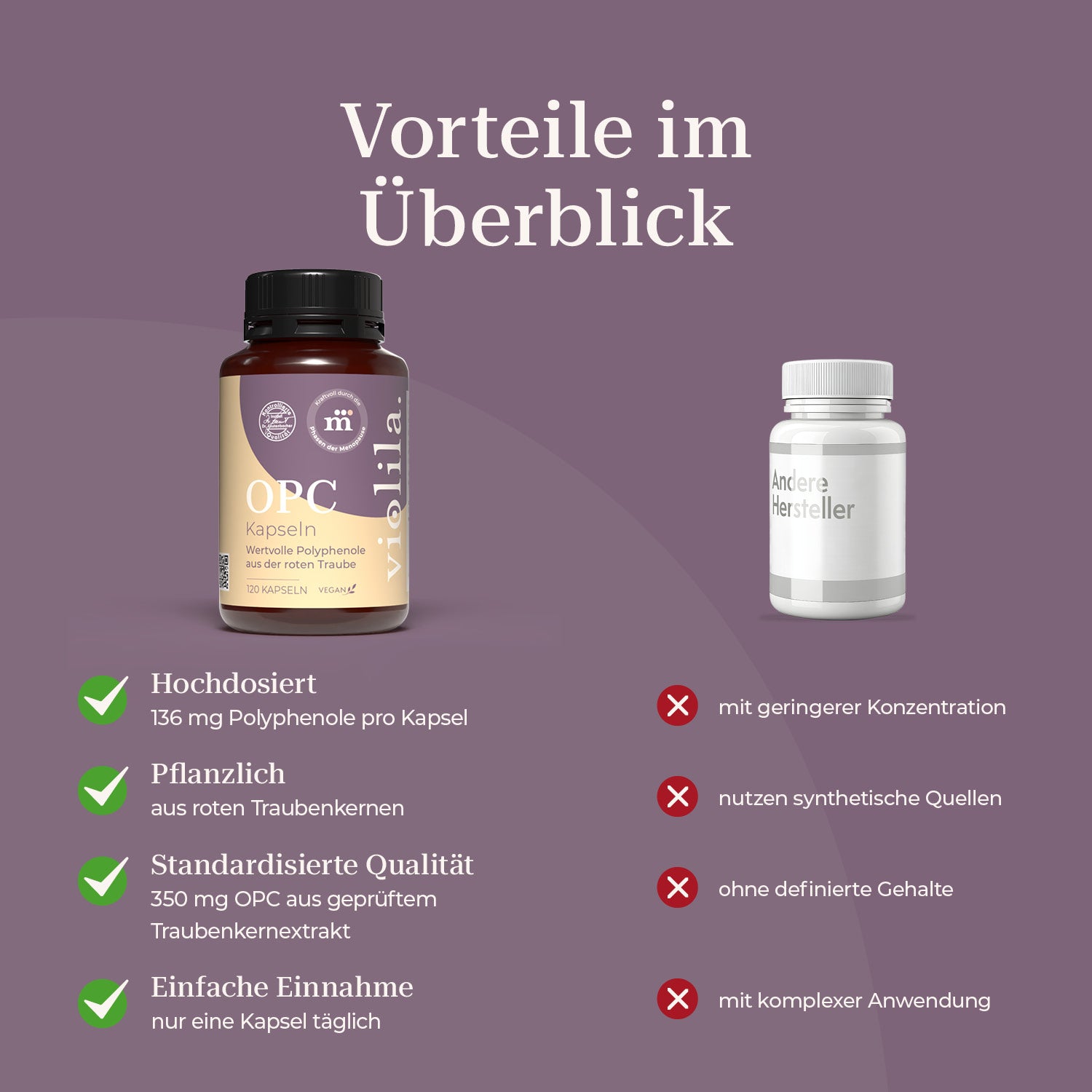 violila OPC Kapseln enthalten hochkonzentrierten Traubenkernextrakt mit einem besonders hohen Anteil an OPC (oligomeren Proanthocyanidinen).